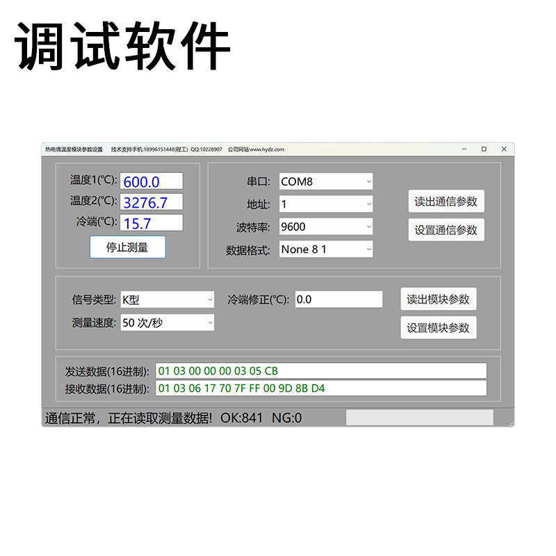 測量熱電偶(K、E、J、N、T、R、B、S、C)溫度傳感器信號,通過RS485通信或模擬量變送輸出。RS485通信接口,采用標準的modbus-rtu協議,可與各種組態軟件,PLC,觸摸屏等聯網通信,通信地址:1~247;波特率:2400、4800、9600、19200、38000、57600、115200;校驗位:無校驗,奇校驗,偶校驗。模擬量變送輸出,模擬量可選DC4-20mA,DC0-20mA,DC0-5V,DC0-10V等,輸出的模擬量與測量溫度成正比。電源輸入范圍DC9~36V,電源,輸入信號,RS485通信,模擬量變送輸出之間相互電氣隔離,隔離電壓≥2KV。提供參數設置上位機軟件,方便對模塊參數設置及通信調試。