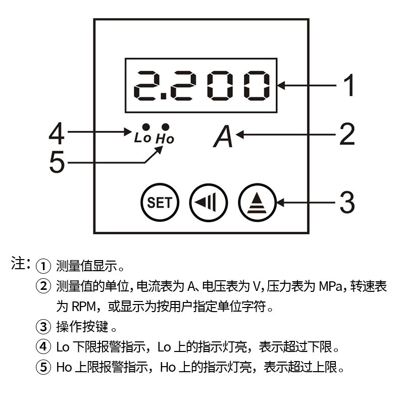②、測量值的單位,電流表為A、電壓表為V,壓力表為MPa,轉速表為RPM,或顯示為按用戶指定顯示單位。