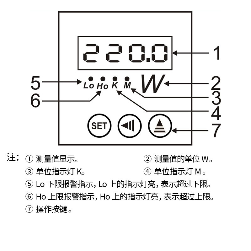 ⑥、Ho上限報警指示,Ho上的指示燈亮,表示超過上限 。